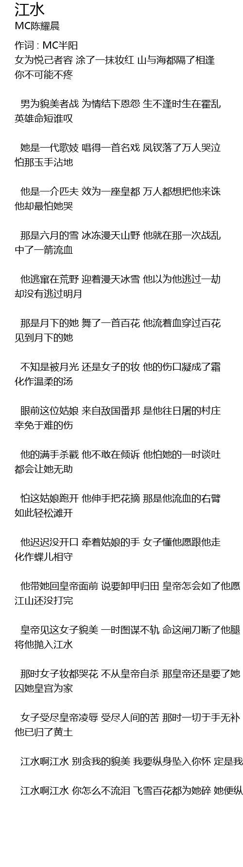 | 江水啊江水 别贪我的貌美 我要纵身坠入你怀 定是我不后悔 | |