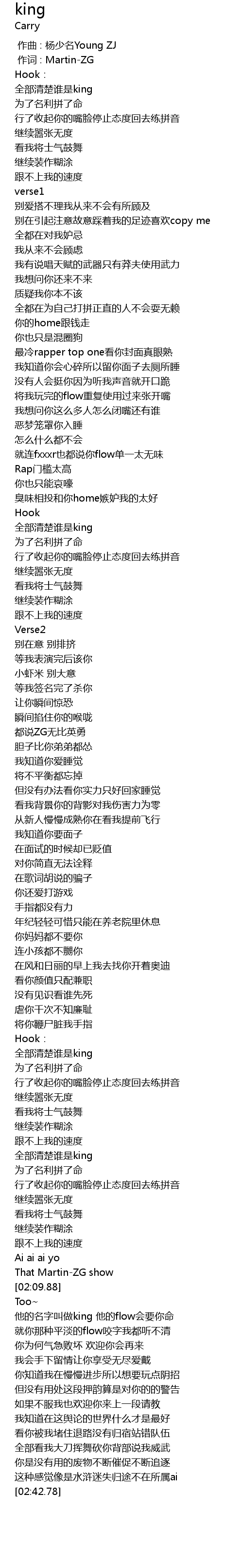| [02:13.42] | 他的名字叫做king 他的flow会要你命 |