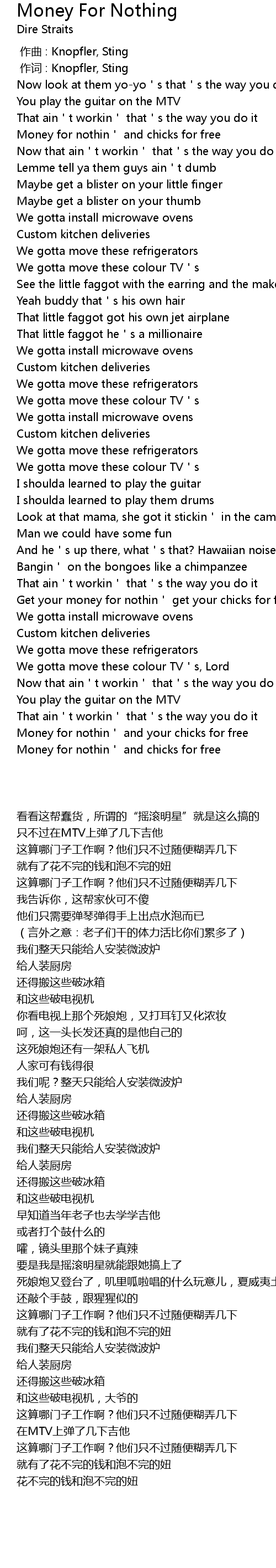 | [05:09.720] | Money for nothin' and your chicks for free |
