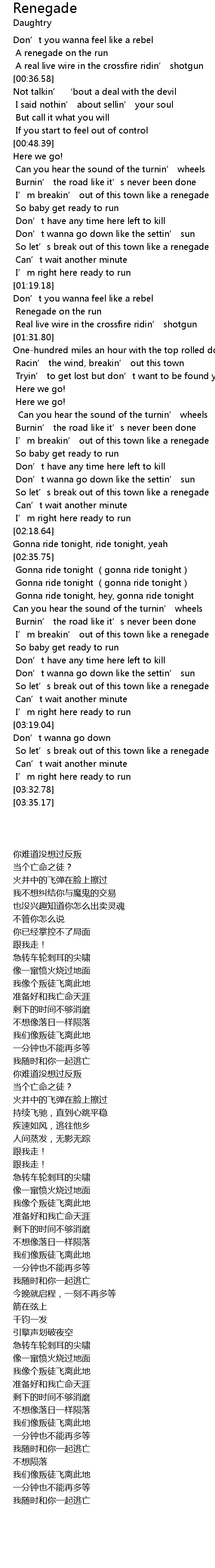 | [03:23.84] | So let' s break out of this town like a renegade |