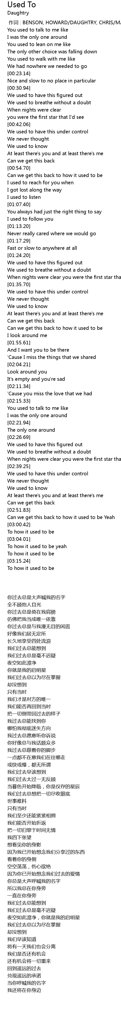 | [00:00.00] | 作词 : BENSON, HOWARD/DAUGHTRY, CHRIS/MALOY, ZACH |