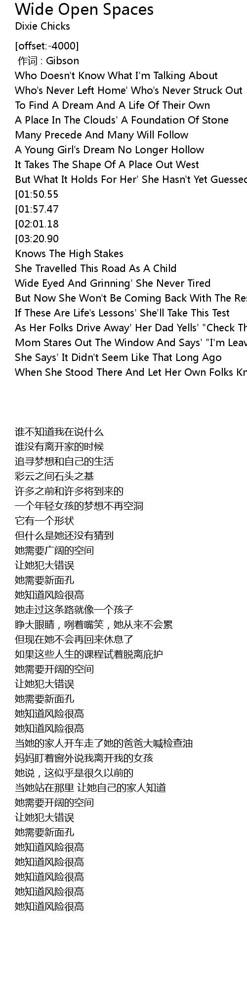 | [02:54.61][01:50.55][01:07.92] | She Needs Wide Open Spaces |