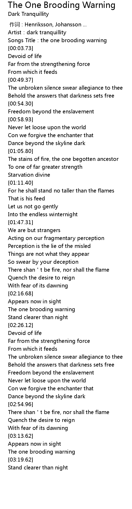 | [03:17.87] | The one brooding warning |