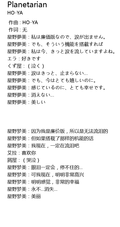 | [00:03.52] | 星野梦美:因为我是廉价版,所以是无法流泪的 |