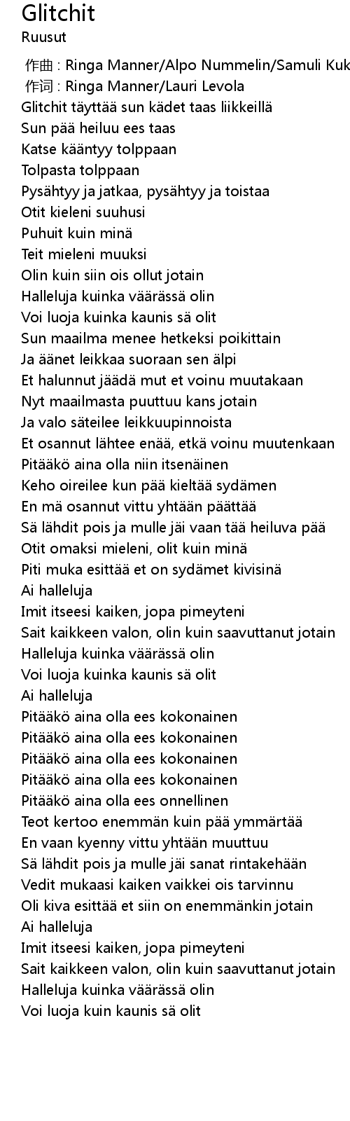 | [00:00.000] | zuo qu : Ringa Manner Alpo Nummelin Samuli Kukkola Miikka Koivisto |