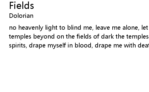 | no heavenly light to blind me, leave me alone, let me wither away, to the temples beyond on the fields of dark the temples of beauty, among the hills of spirits, drape myself in blood, drape me with death |