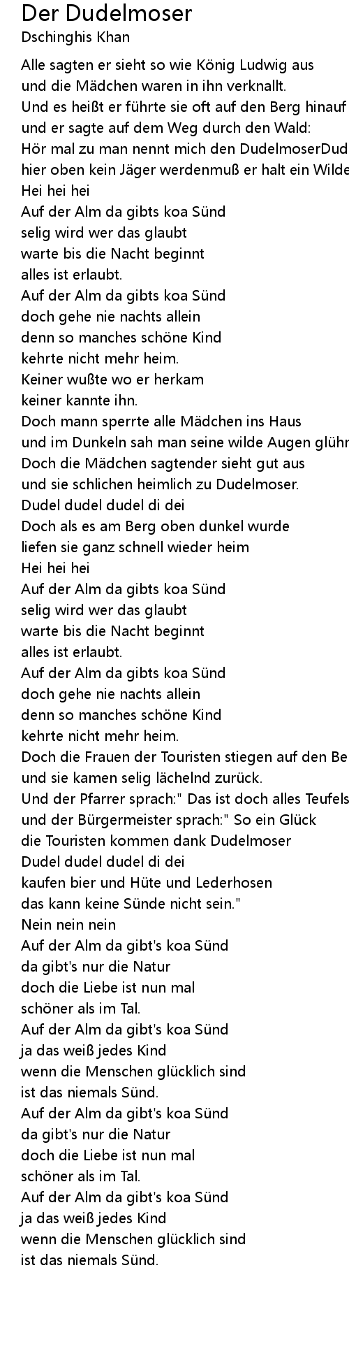 | Hör mal zu man nennt mich den DudelmoserDudel dudel dudel di deiwill ein Mann hier oben kein Jäger werdenmuß er halt ein Wilderer sein. | |