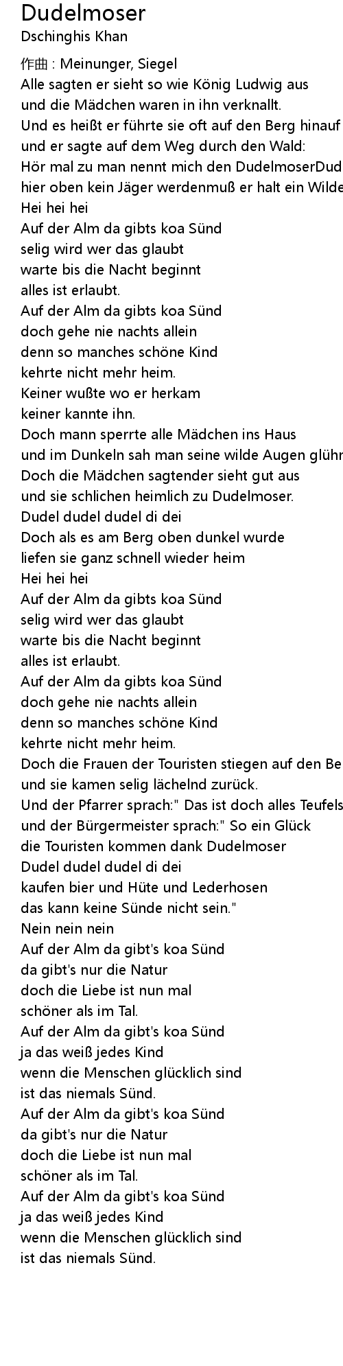 | Hör mal zu man nennt mich den DudelmoserDudel dudel dudel di deiwill ein Mann hier oben kein Jäger werdenmuß er halt ein Wilderer sein. | |