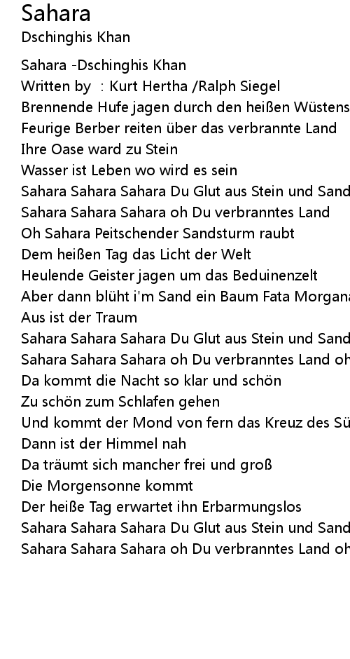 | [01:45.284] | Sahara Sahara Sahara oh Du verbranntes Land oh Sahara |