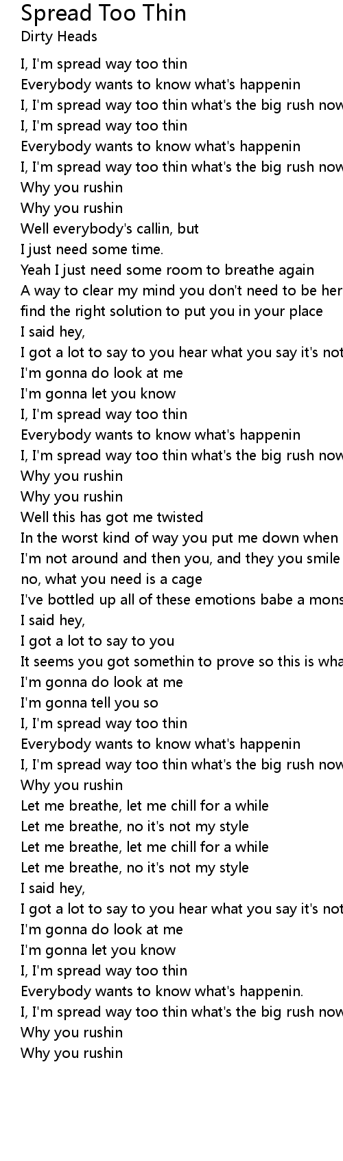 I, I'm spread way too thin what's the big rush now, tell me why you're rushin |