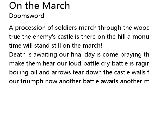 | A procession of soldiers march through the woods vegeance is waiting to become true the enemy's castle is there on the hill a monument to our victory through time will stand still on the march! | |