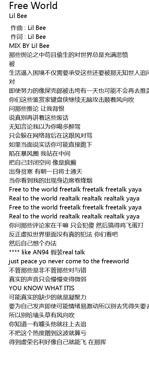 | [00:01.000] | 作词 : Lil Bee |