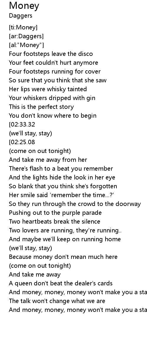 | [02:40.69][02:25.08][00:46.30] | Because money don't mean much here |