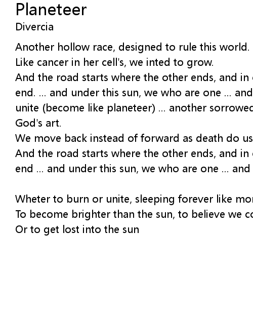 And the road starts where the other ends, and in our heart's beginning is the end. ... and under this sun, we who are one ... and under this sun, we must unite (become like planeteer) ... another sorrowed mind like dying |