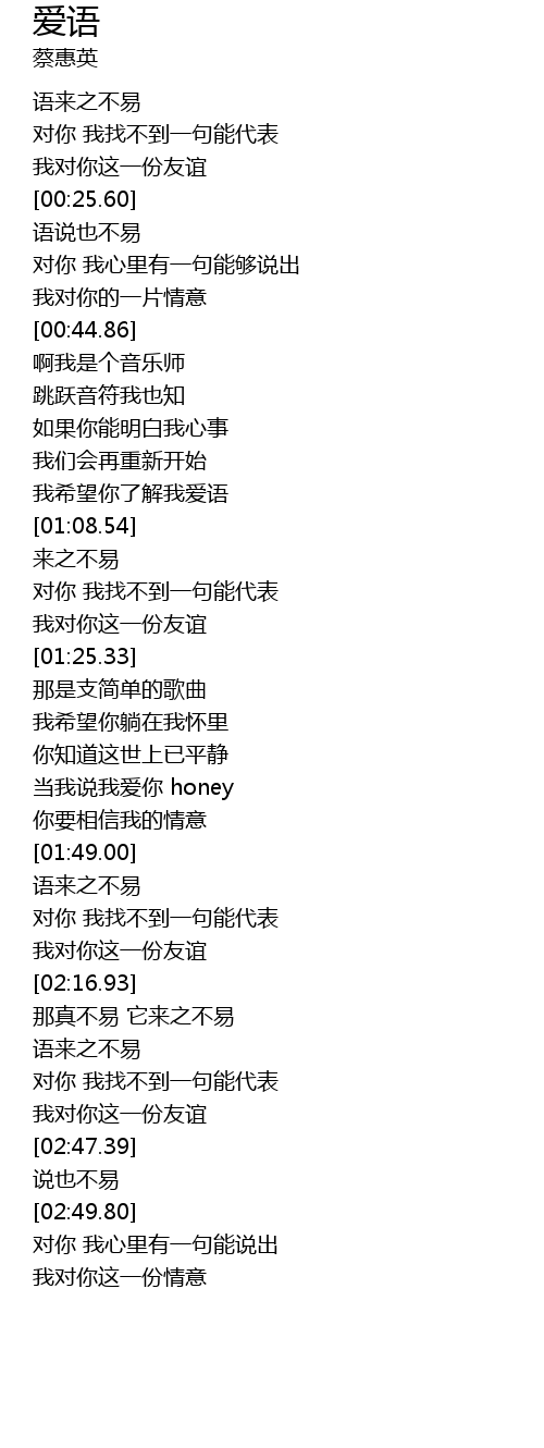 | [01:38.48] | 当我说我爱你 honey |