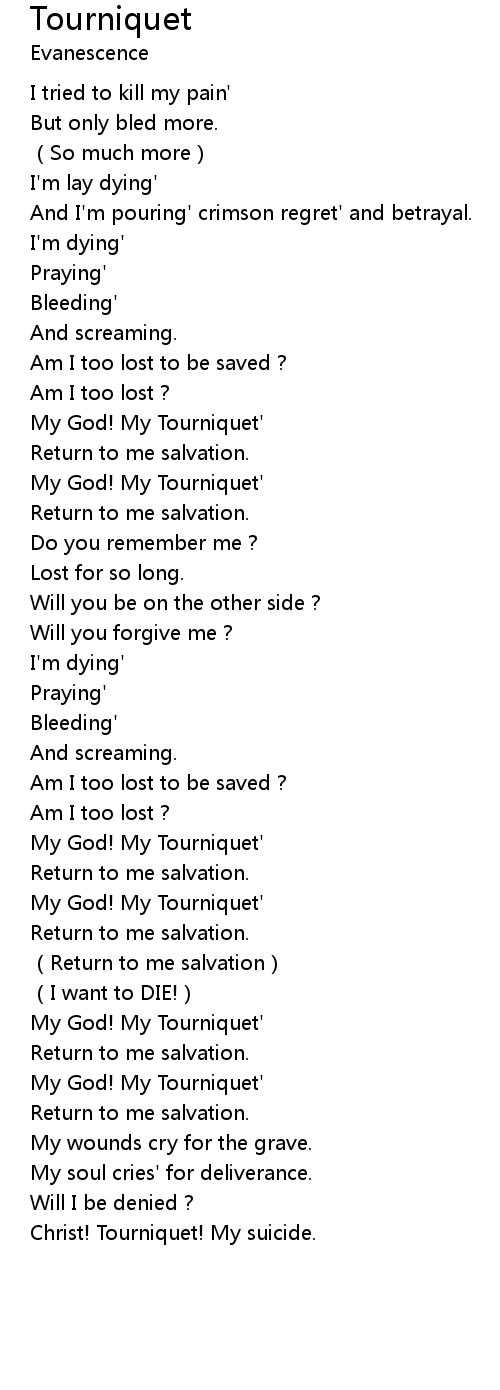| [03:24.320] | Christ! Tourniquet! My suicide. |
