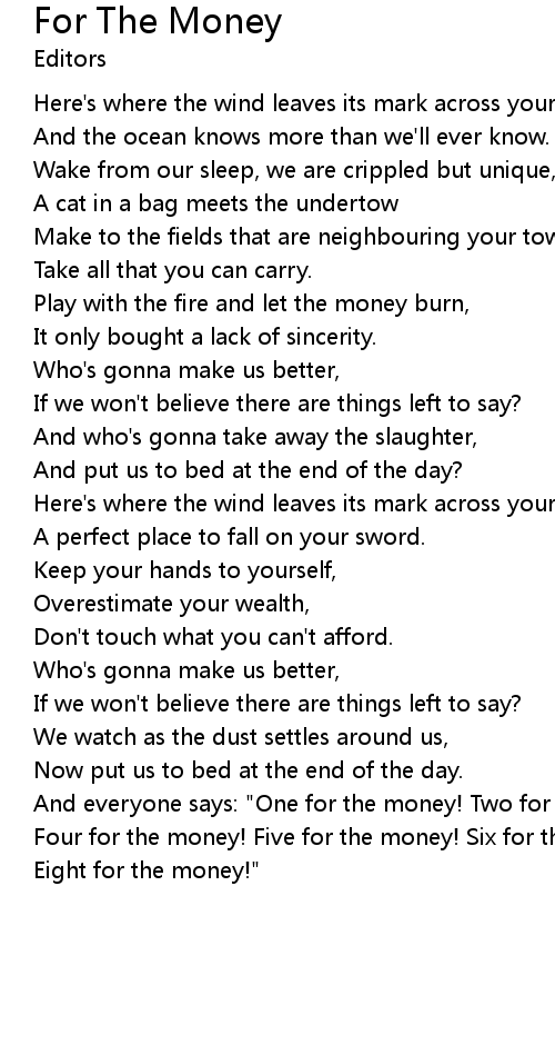 And everyone says: "One for the money! Two for the money! Three for the money! Four for the money! Five for the money! Six for the money! Seven for the money! Eight for the money!" |