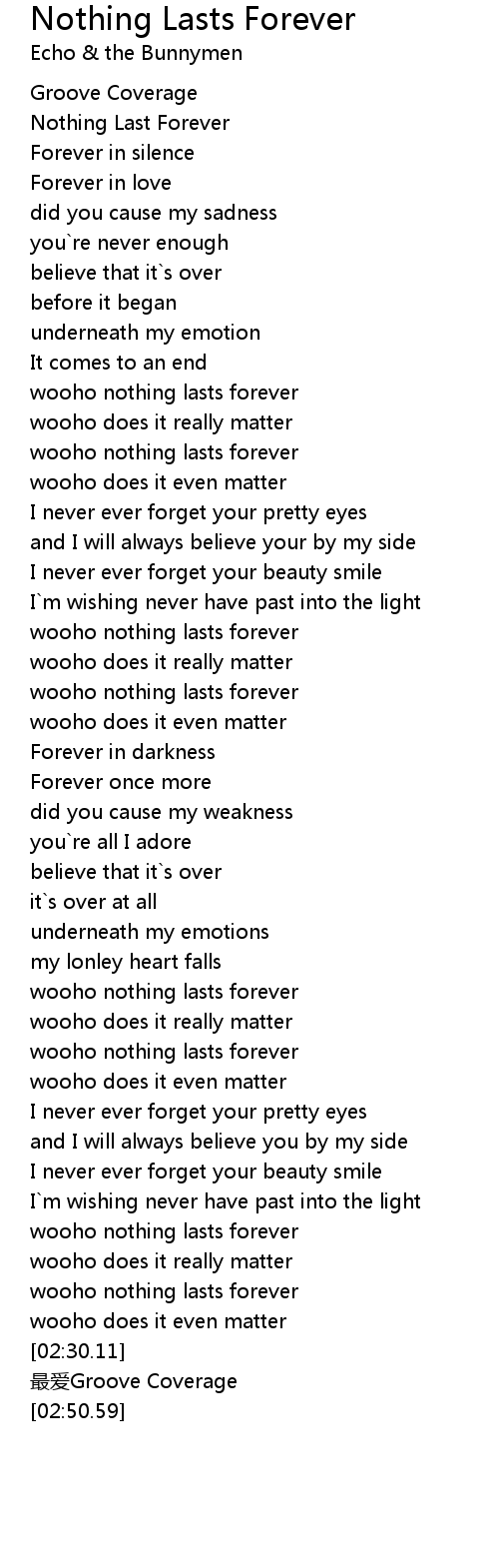 | [00:01.50] | Nothing Last Forever |