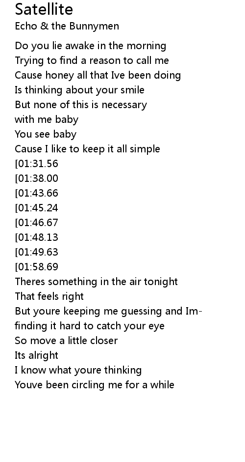 | [02:17.00][01:31.56][00:41.67] | Cause you are my Satellite |