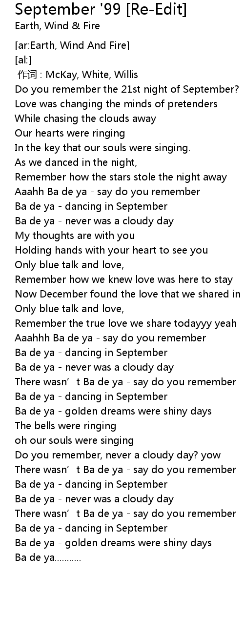 | [00:49.130] | Ba de ya dancing in September |