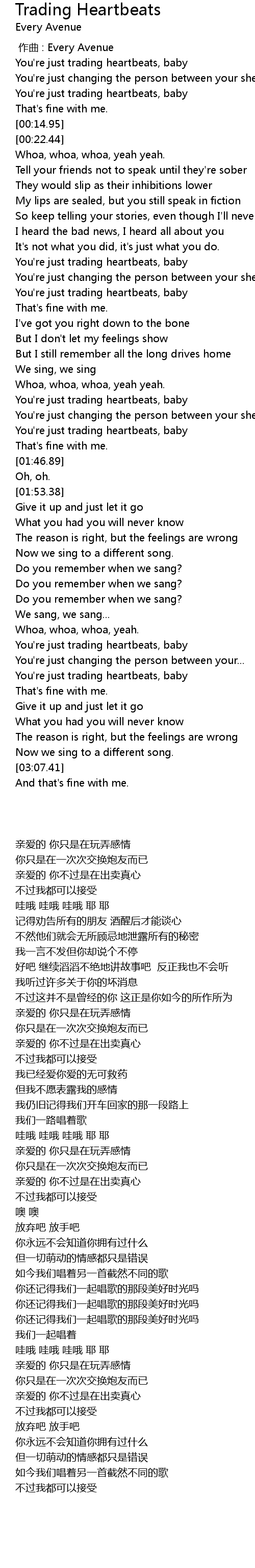 | [00:00.91] | You' re just trading heartbeats, baby |