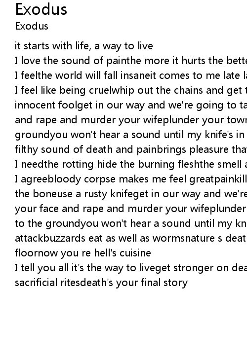 I agreebloody corpse makes me feel greatpainkiller in my lifecut bare flesh to the boneuse a rusty knifeget in our way and we're going to take your lifekick in your face and rape and murder your wifeplunder your town your homes they'll burn to the groundyou won't hear a sound until my knife's in your backand the exodus attackbuzzards eat as well as wormsnature s death machinespin you on the desert floornow you re hell's cuisine