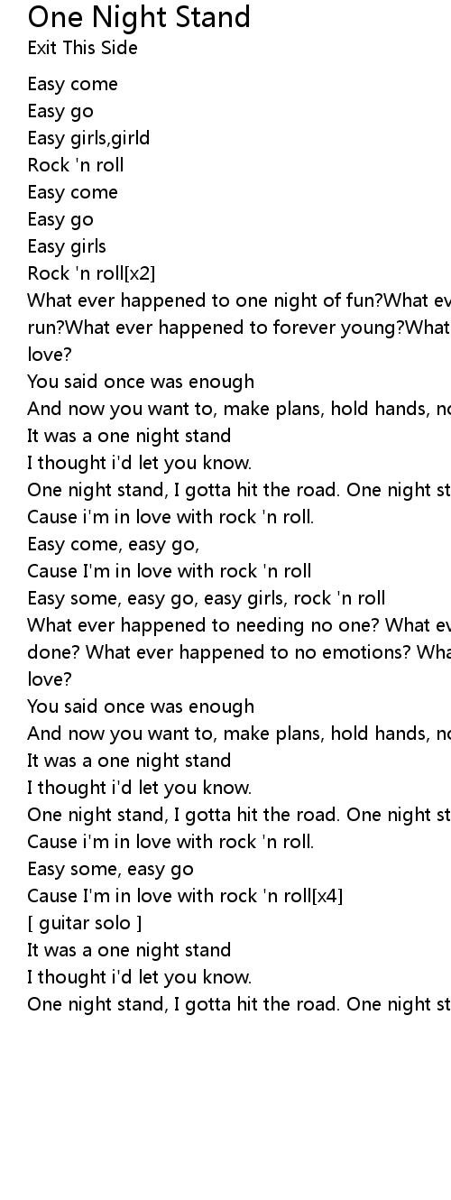 One night stand, I gotta hit the road. One night stand, you gotta let me go. Cause i'm in love with rock 'n roll.[x2] |