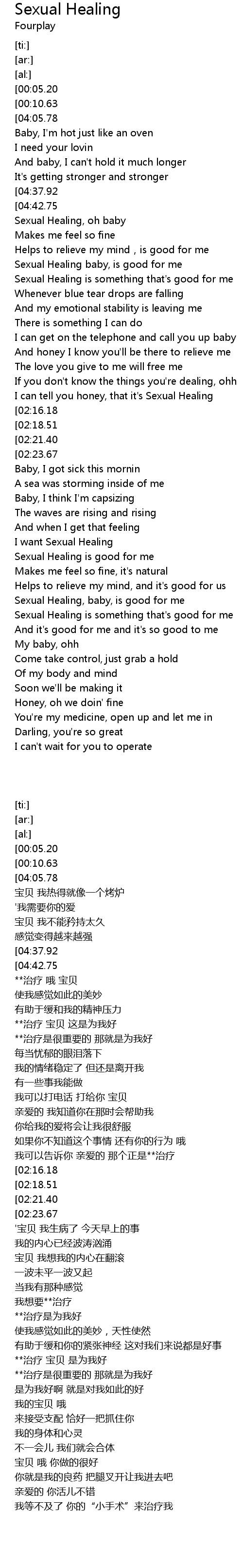| [03:10.37] | Sexual Healing, baby, is good for me |