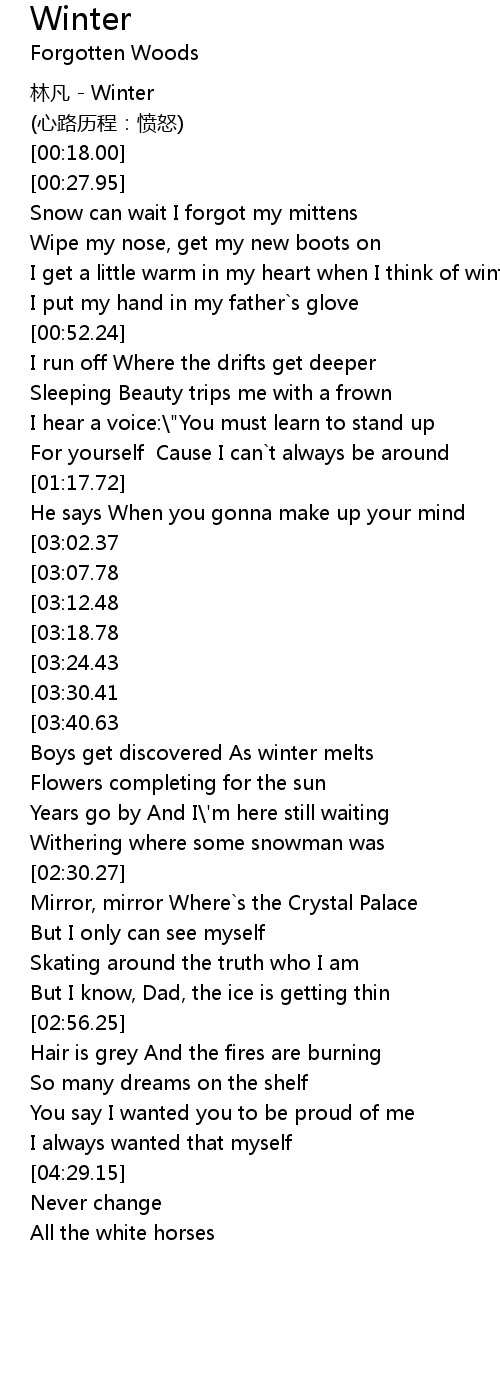 | [00:28.48] | Snow can wait I forgot my mittens |