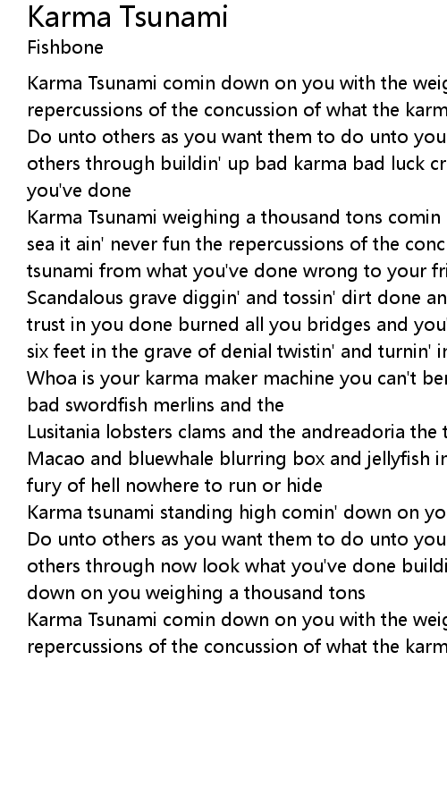 Karma Tsunami weighing a thousand tons comin down on you with the weight of the sea it ain' never fun the repercussions of the concussion of what the karma tsunami from what you've done wrong to your friends |