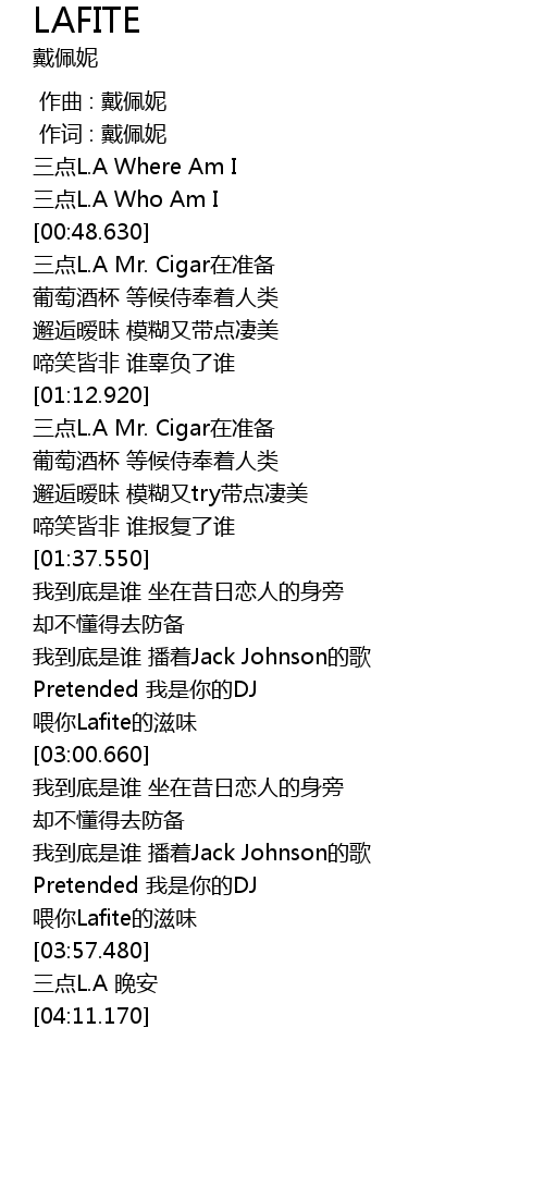 | [03:29.650] | wèi nǐ Lafite de zī wèi |