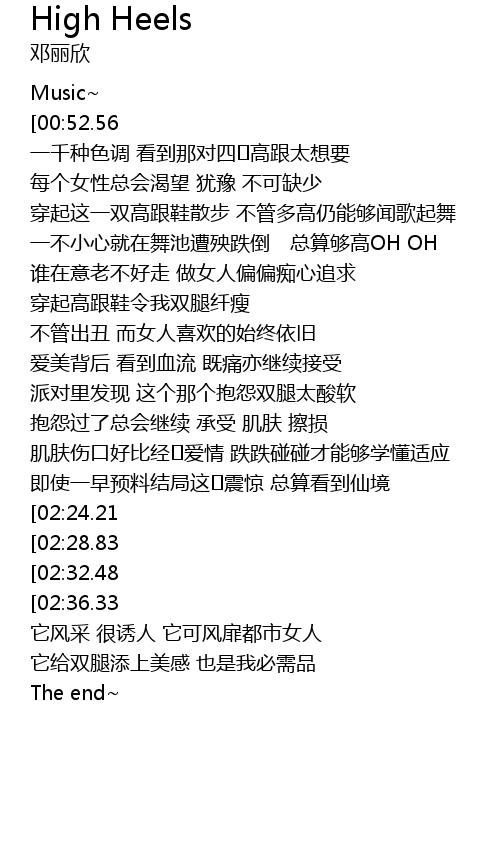 | [00:38.91] | 穿起这一双高跟鞋散步 不管多高仍能够闻歌起舞 |
