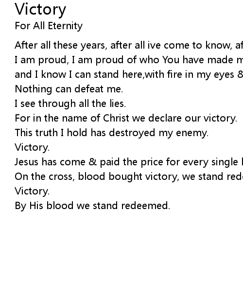 | On the cross, blood bought victory, we stand redeemed, we stand redeemed. | |