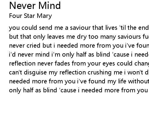 you could send me a saviour that lives 'til the end of time promise the heavens but that only leaves me dry too many saviours fuck with me i won't die i've never cried but i needed more from you i've found my life without you now and i'd never mind i'm only half as blind 'cause i needed more from you you say my reflection never fades from your eyes could change my direction but what i feel can't disguise my reflection crushing me i won't die i've never cried but i needed more from you i've found my life without you now and i'd never mind i'm only half as blind 'cause i needed more from you |