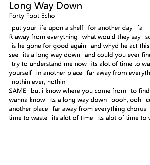 SAME -but i know where you come from -to find yourself again chorus -i dont wanna know -its a long way down -oooh, ooh -could you ever see yourself -in another place -far away from everything chorus -its alot of time -its alot of time to waste -its alot of time -its alot of time to waste |