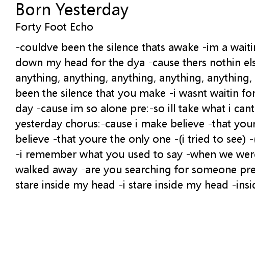 -couldve been the silence thats awake -im a waitin for another chance -i lay down my head for the dya -cause thers nothin else -anything, anything, anything, anything, anything, anything, anything, anything, anything, anything -couldve been the silence that you make -i wasnt waitin for you -ill lay my head for the day -cause im so alone pre:-so ill take what i cant have -but i wasnt born yesterday chorus:-cause i make believe -that youre inside of my head -i make believe -that youre the only one -(i tried to see) -(what keeps me hanging on) -i remember what you used to say -when we were alone -i held down my hand, you walked away -are you searching for someone pre-chorus -i stare inside my head -i stare inside my head -i stare inside my head -inside my head chorus |