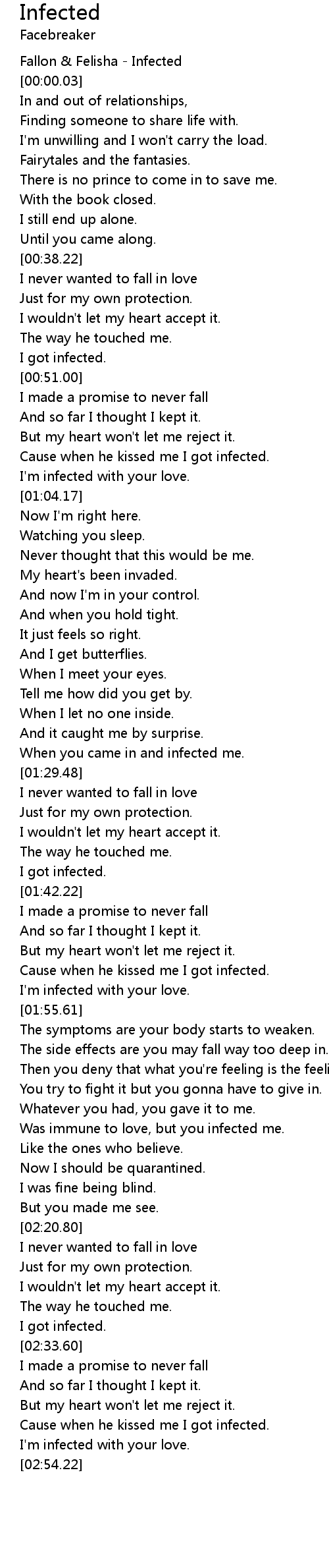 [02:42.18] Cause when he kissed me I got infected.