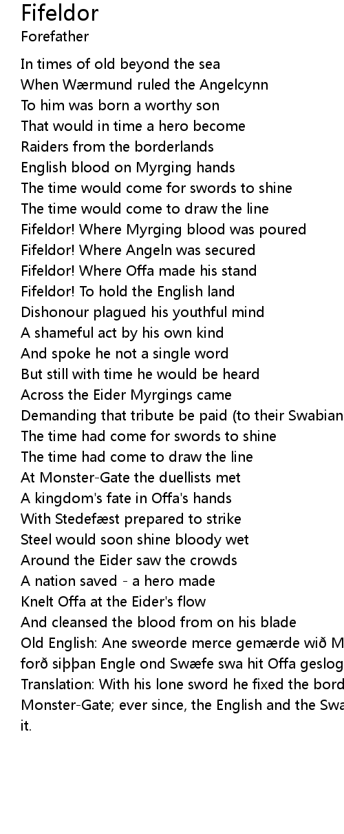 | Old English: Ane sweorde merce gemærde wið Myrgingum bi Fifeldore; heolden forð siþþan Engle ond Swæfe swa hit Offa geslog | |