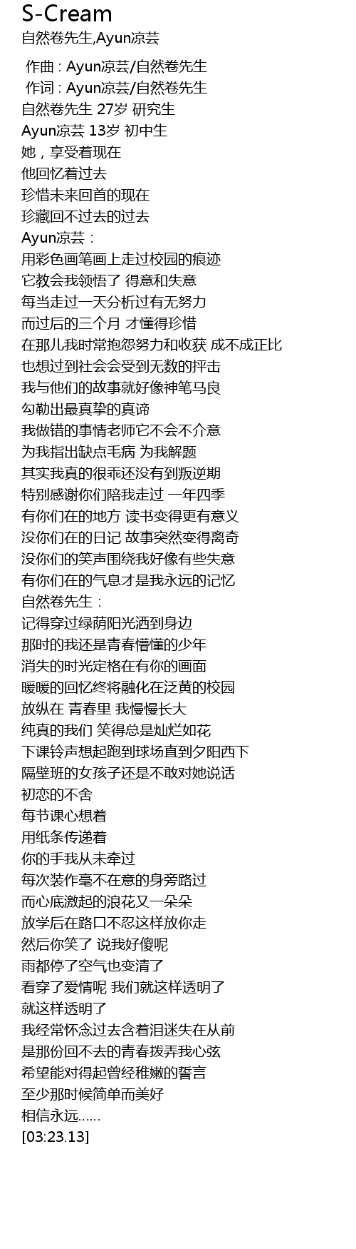 | [00:16.90] | Ayun凉芸 13岁 初中生 |