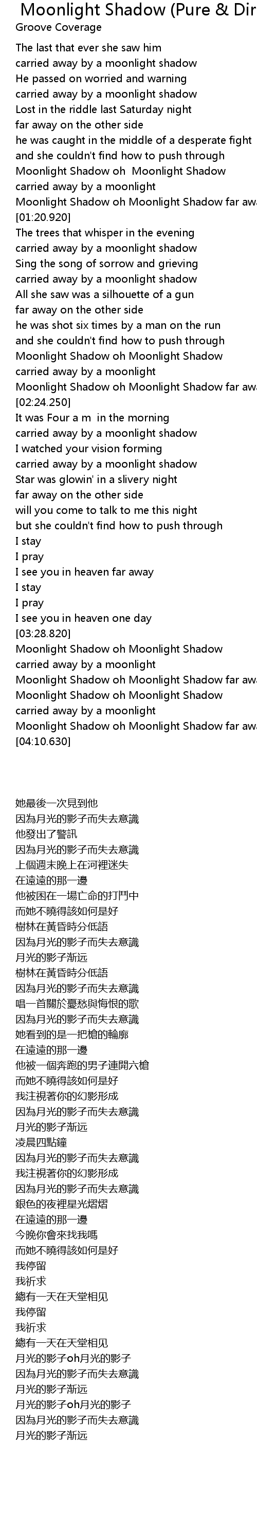 | [03:30.200] | Moonlight Shadow oh Moonlight Shadow |
