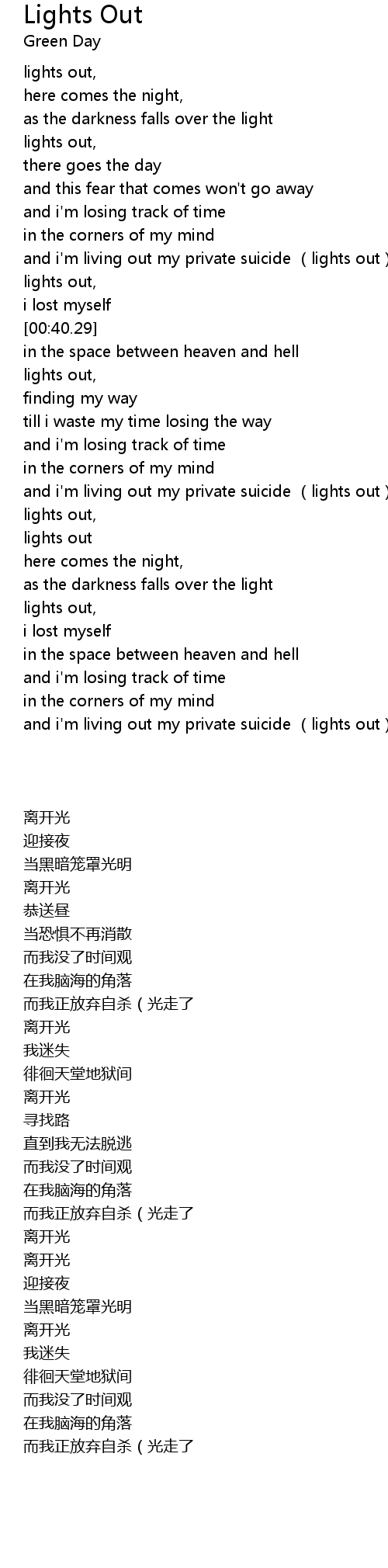 | [00:29.93] | and i' m living out my private suicide lights out |