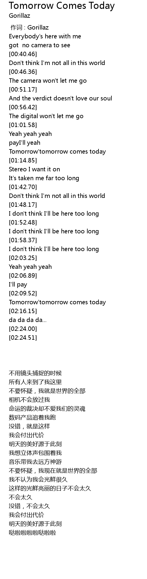 | [02:10.07] | Tomorrow' tomorrow comes today |