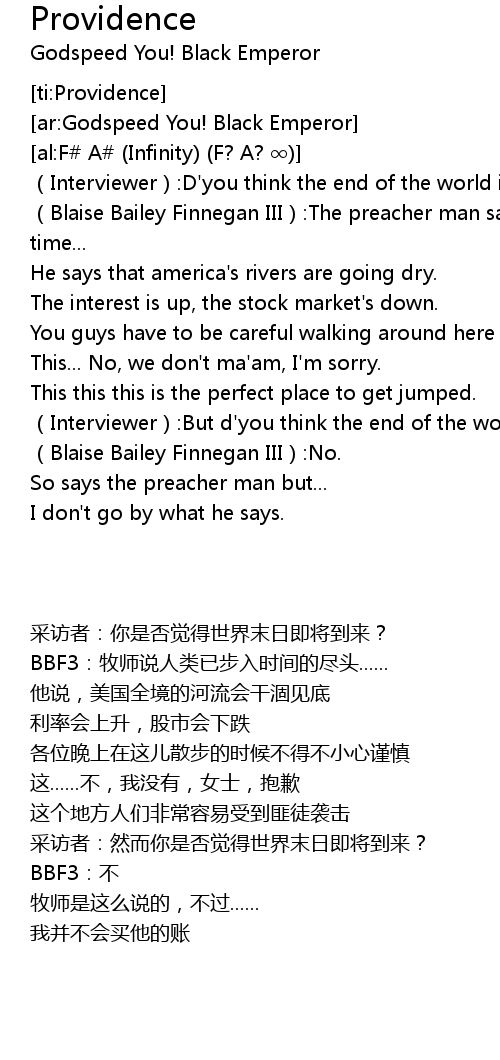 | [00:20.76] | Blaise Bailey Finnegan III: The preacher man says it' s the end of time... |