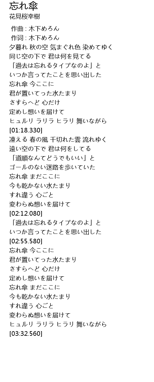 | [03:10.820] | 忘れ傘 まだここに |