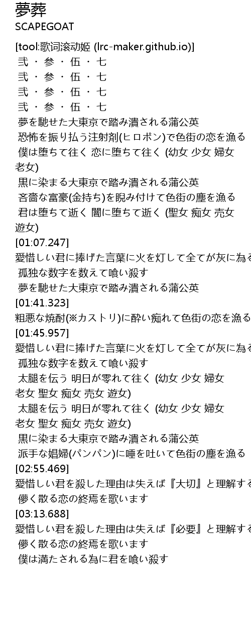 | [02:35.623] | 黒に染まる大東京で踏み潰される蒲公英 |