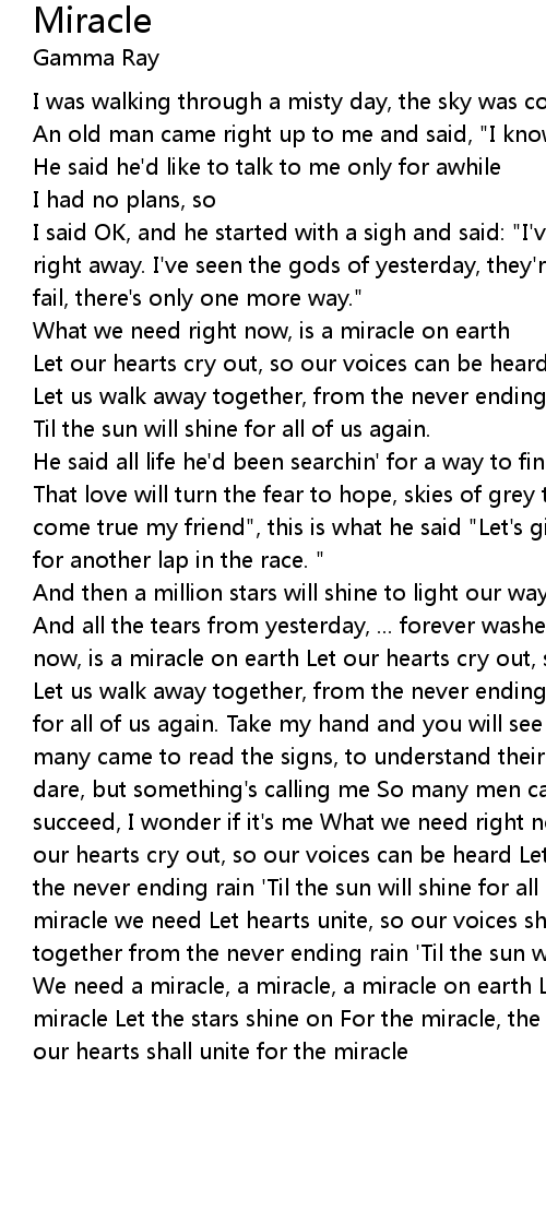 And all the tears from yesterday, ... forever washed away." What we need right now, is a miracle on earth Let our hearts cry out, so our voices can be heard Let us walk away together, from the never ending rain 'Til the sun will shine for all of us again. Take my hand and you will see the mirror of your destiny So many came to read the signs, to understand their meaning Now I see I do not dare, but something's calling me So many men cannot break free, the one who will succeed, I wonder if it's me What we need right now, is a miracle on earth Let our hearts cry out, so our voices can be heard Let us walk away together, from the never ending rain 'Til the sun will shine for all of us again. It's a miracle we need Let hearts unite, so our voices shake the earth Let us walk away together from the never ending rain 'Til the sun will shine for all of us again We need a miracle, a miracle, a miracle on earth Let our hearts cry out for the miracle Let the stars shine on For the miracle, the miracle on earth Our hearts, our hearts shall unite for the miracle |