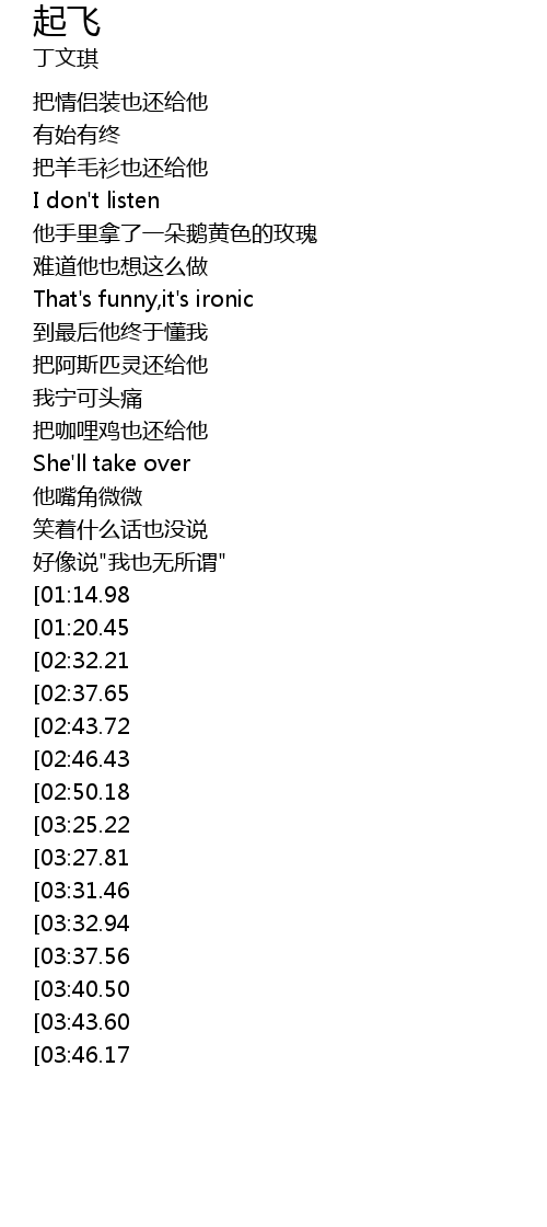 | [03:08.93][02:43.72][01:39.23] | 喔 起飞 |