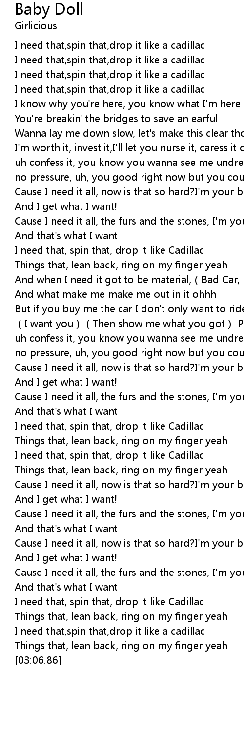 | [00:41.46] | Cause I need it all, now is that so hard? I' m your baby doll |
