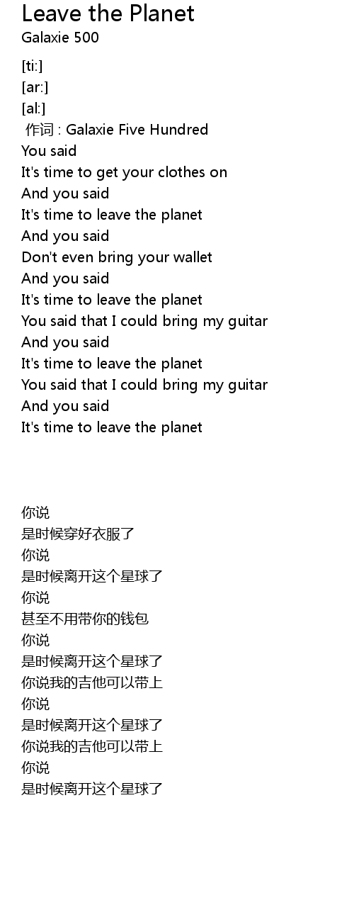 | [00:00.00] | 作词 : Galaxie Five Hundred |