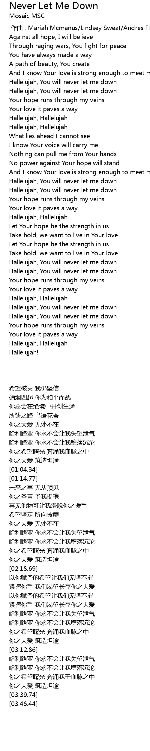 | [03:19.44] | Hallelujah, You will never let me down |